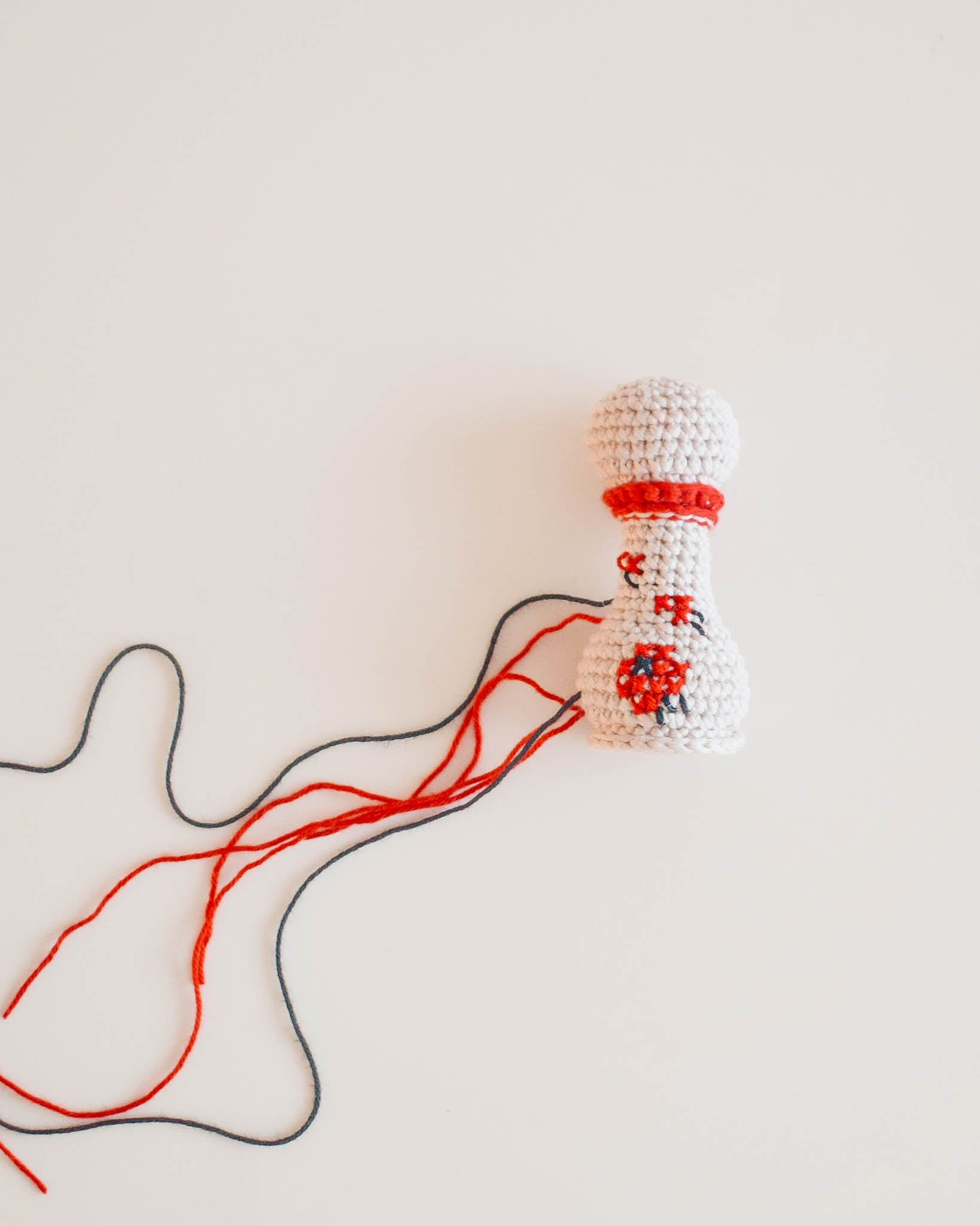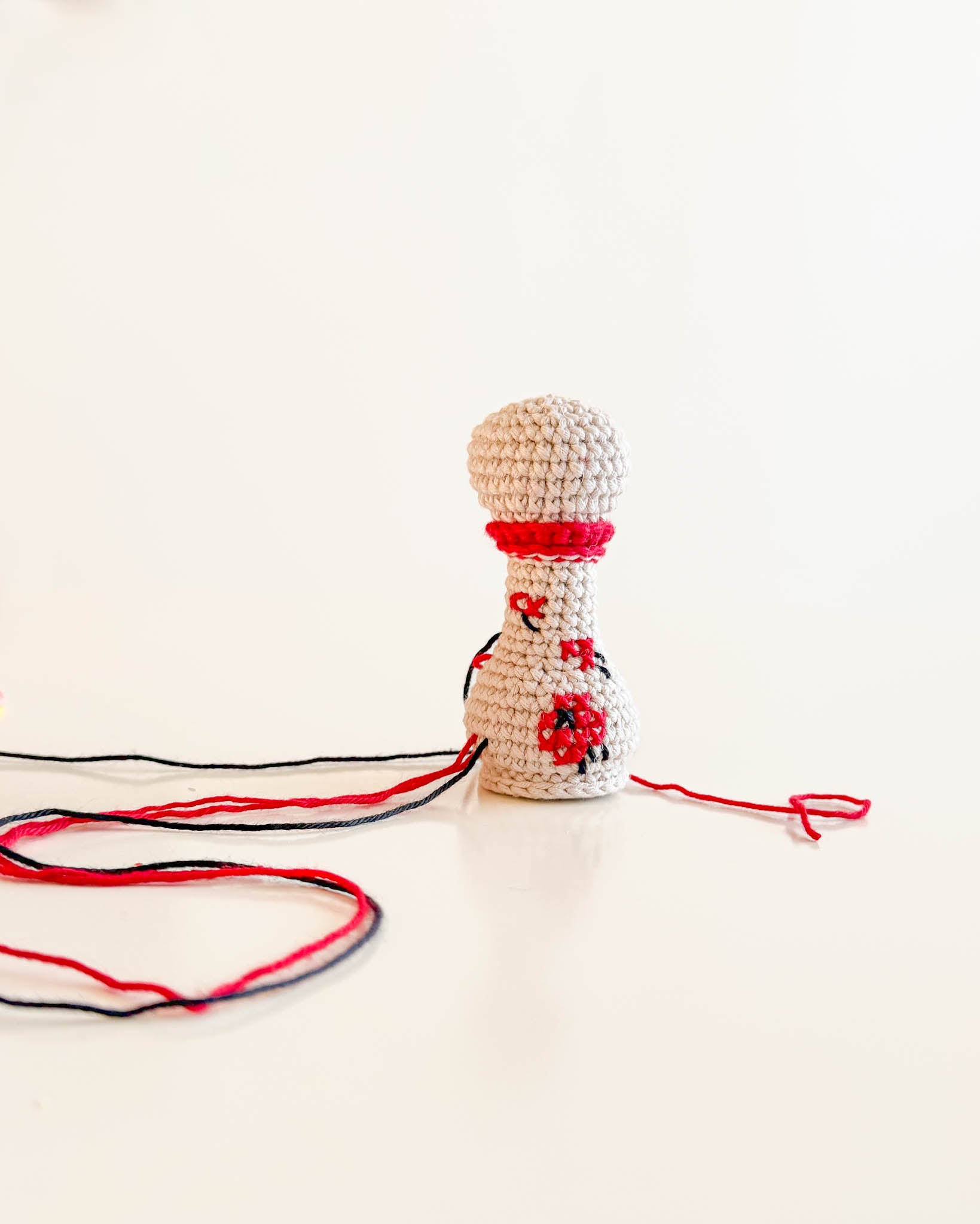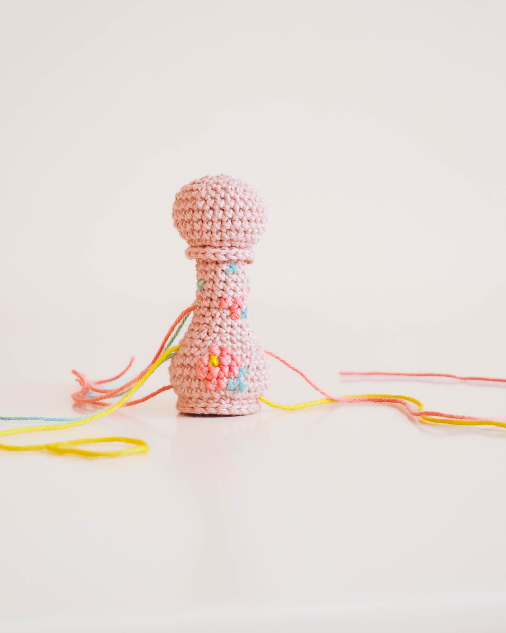 El patrón incluye las instrucciones detalladas para tejer un peón de ajedréz. Contiene fotografías en alta resolución y enlaces a videos explicativos de los procedimientos que, eventualmente, puedan ser más complejos. Se incluye el diseño del muñeco en sí y también sugerencias de bordado.