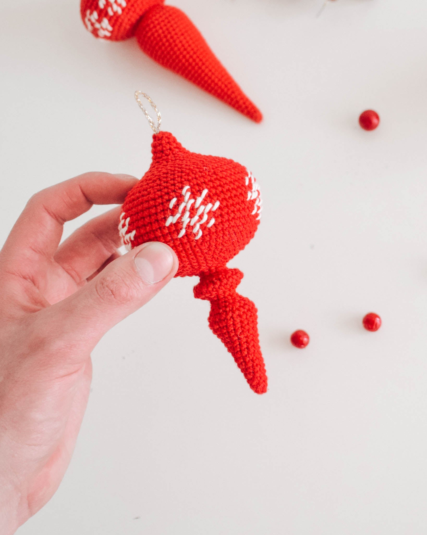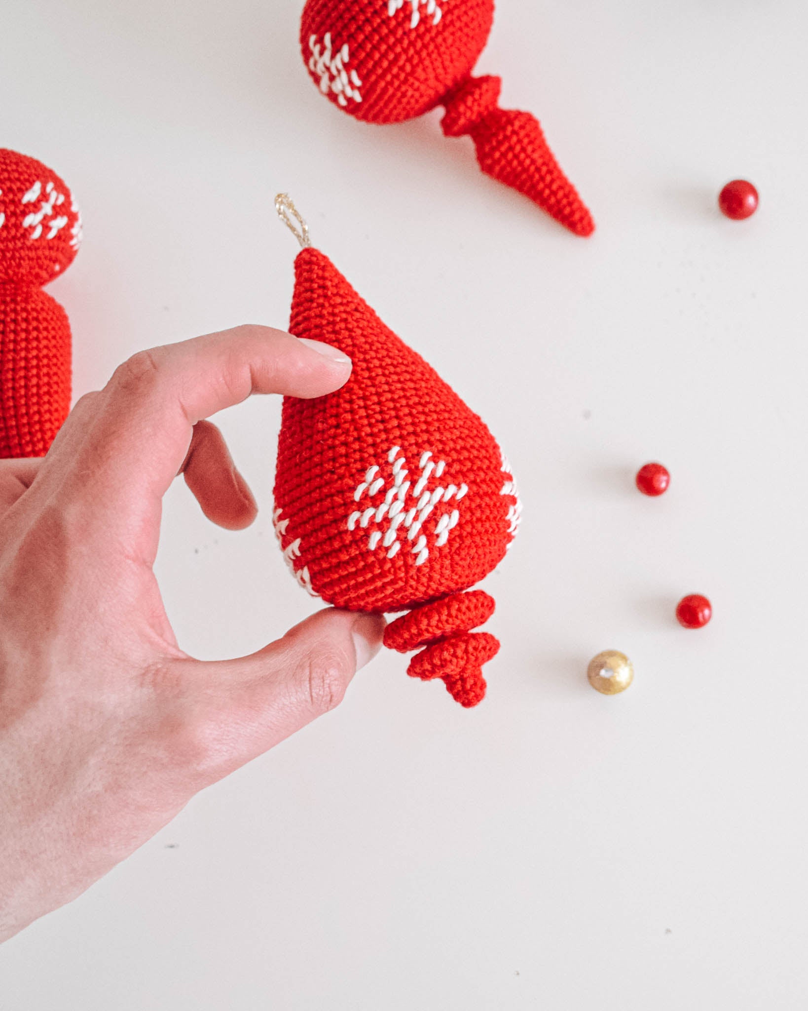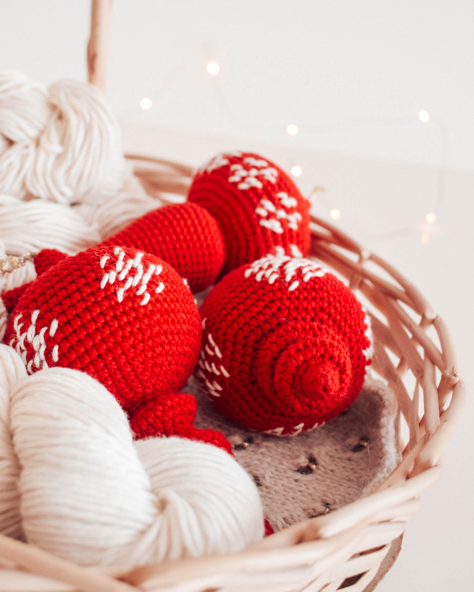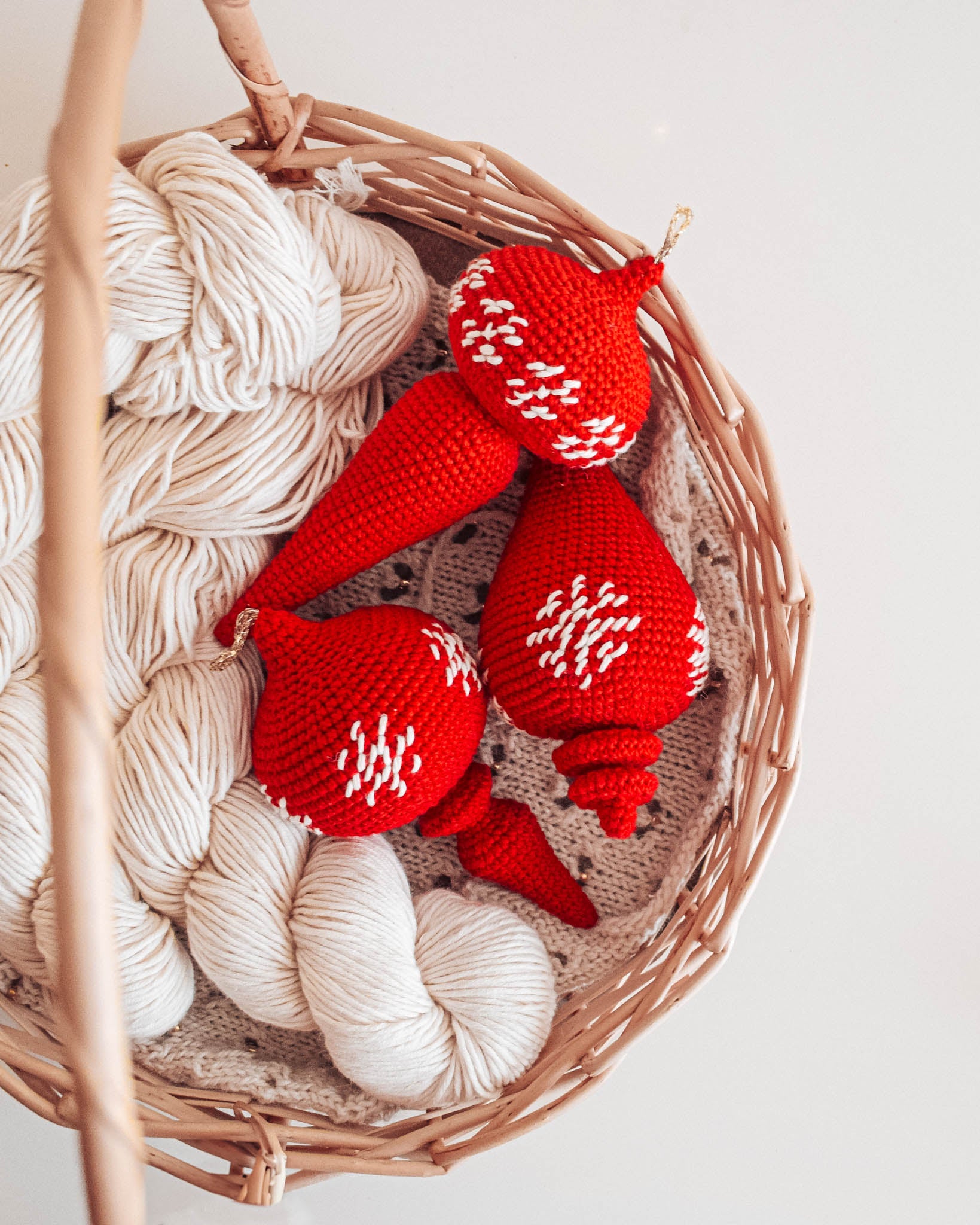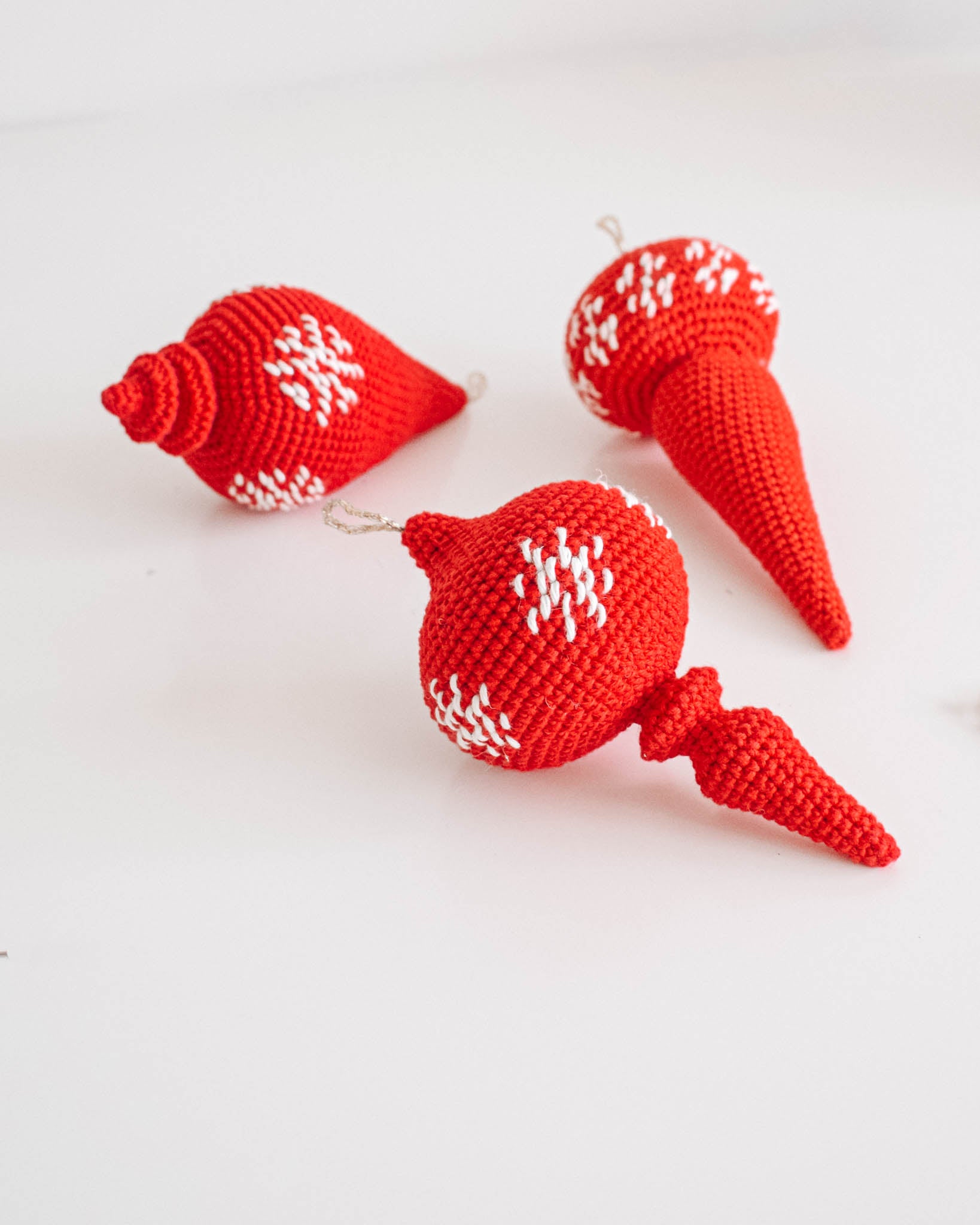 El patrón incluye las instrucciones detalladas para tejer tres tipos de adorno navideño. Contiene fotografías en alta resolución y enlaces a videos explicativos de los procedimientos que, eventualmente, puedan ser más complejos.